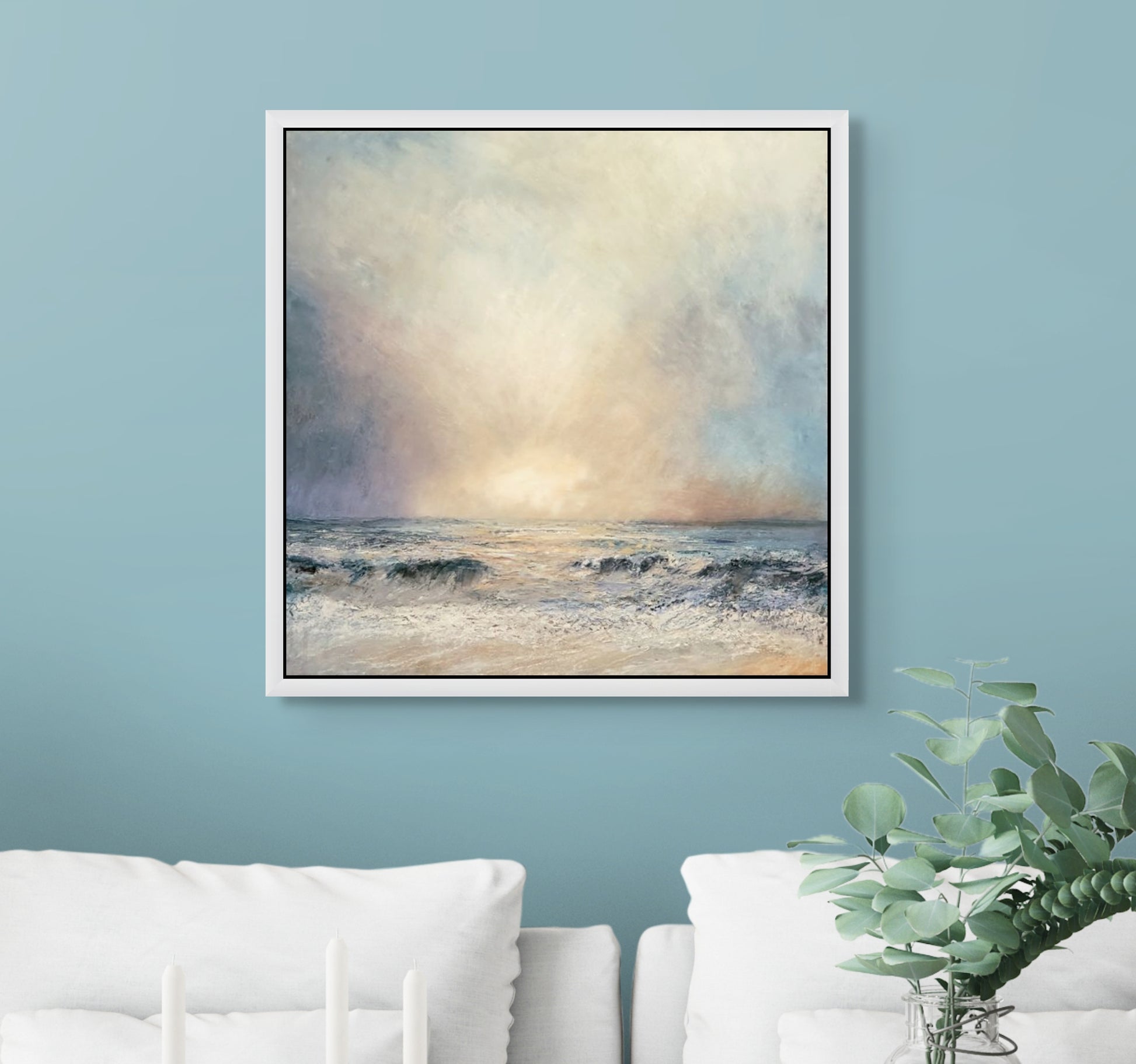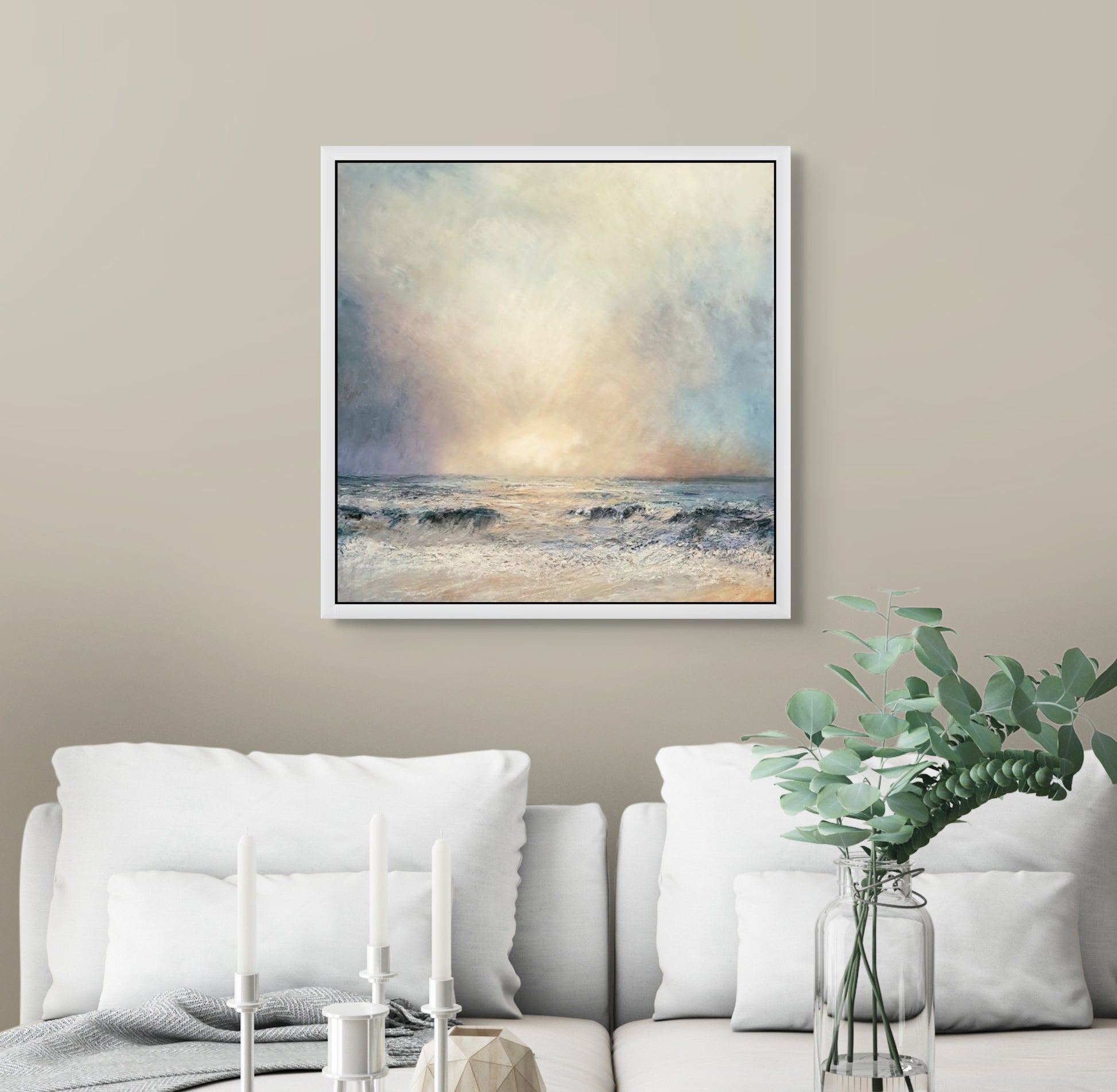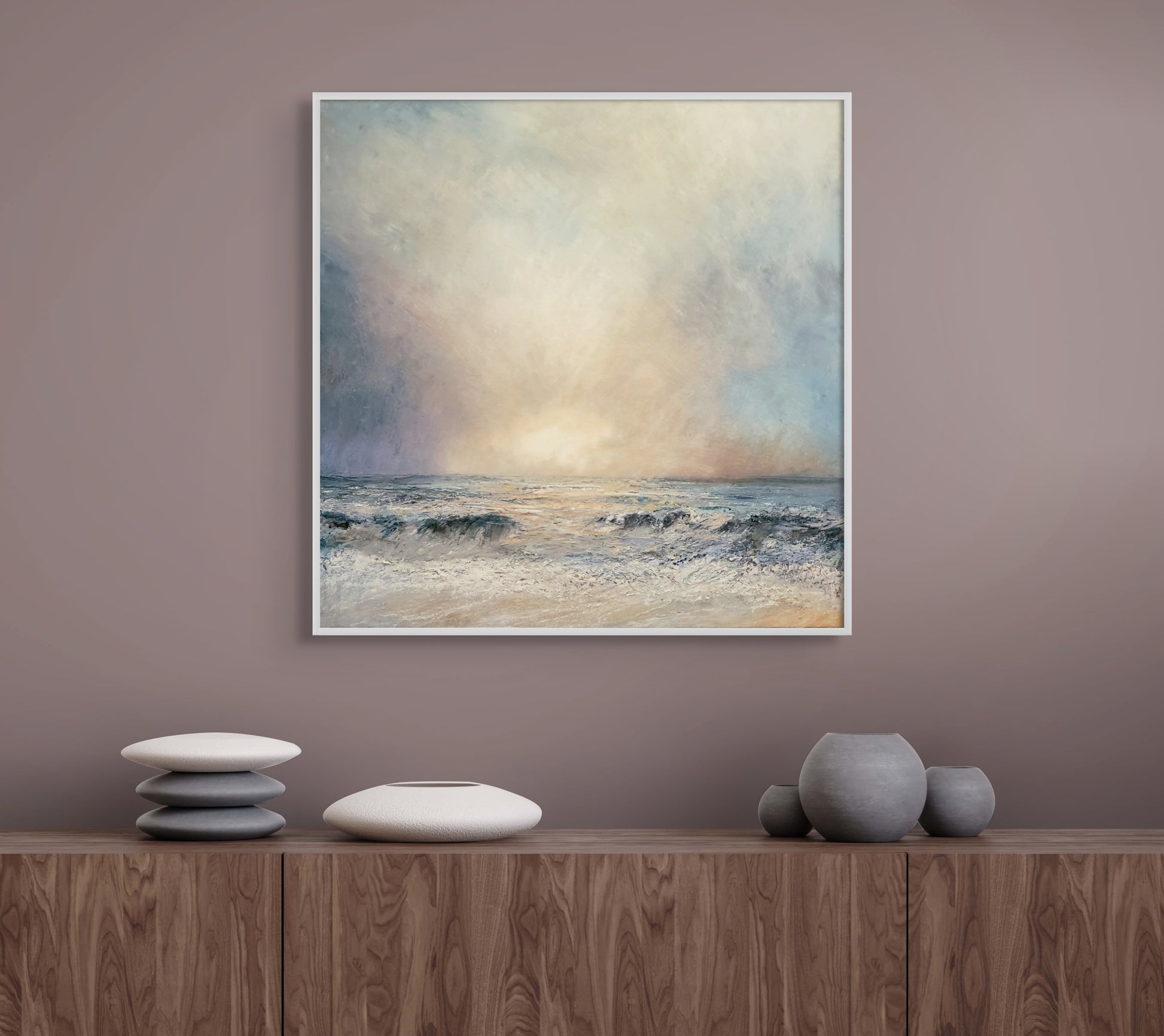 A gentle painting full of subtlety and light. The texture of the waves and the foam are a great contrast to the soft light in the sky. This painting will make a statement anywhere in your home, bringing calm and joy into your space.