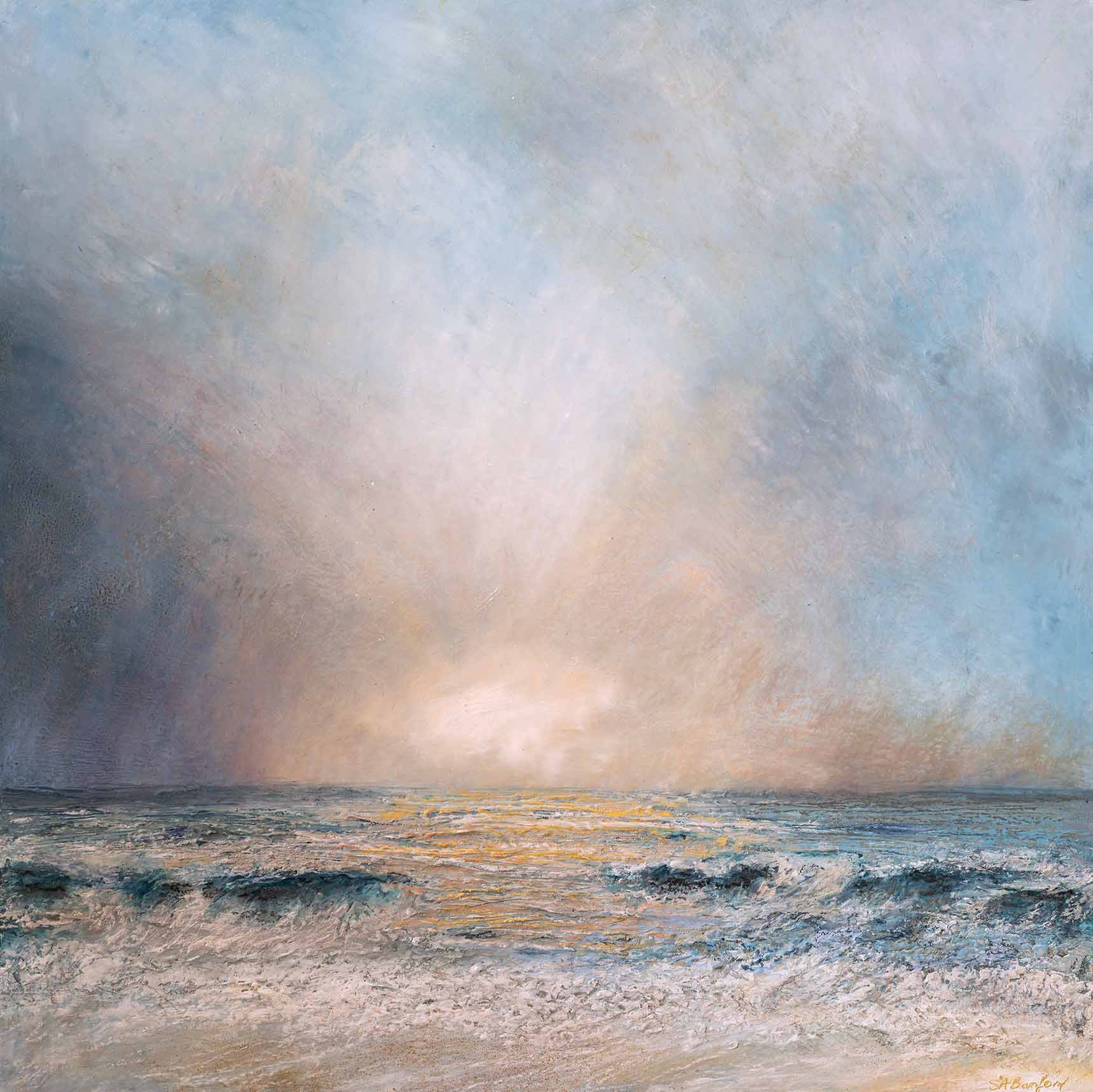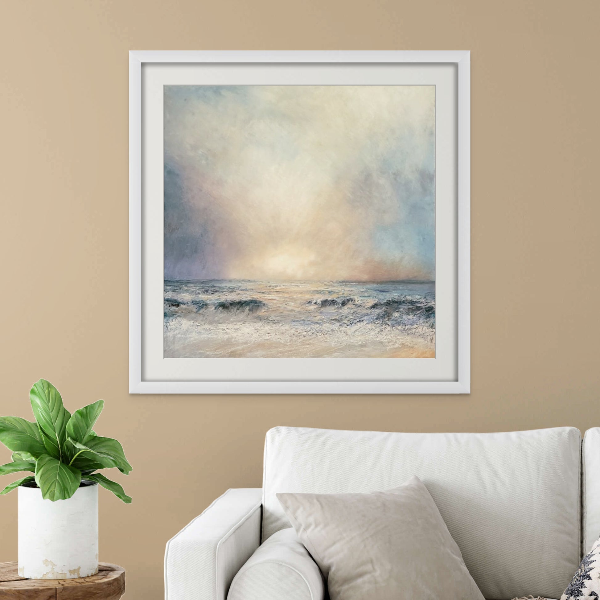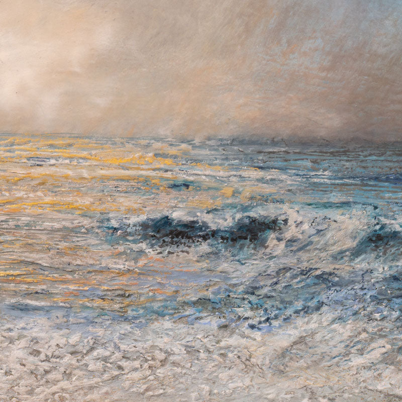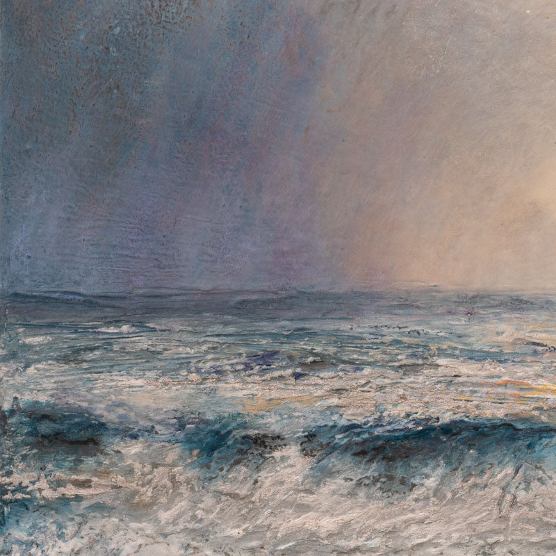 A gentle painting full of subtlety and light. The texture of the waves and the foam are a great contrast to the soft light in the sky. This painting will make a statement anywhere in your home, bringing calm and joy into your space.