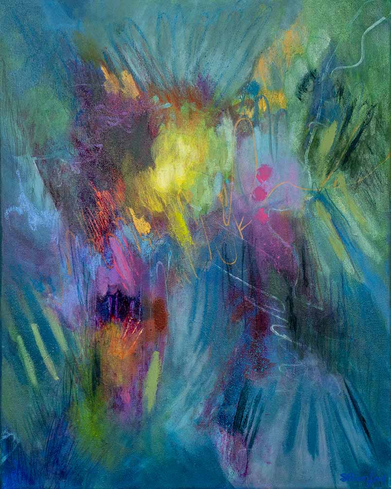Abstract painting inspired by wildflowers and walks through meadows high above the sea. It is colourful and bright and evokes feelings of sunshine, freedom and energy. Bring all of these feelings into your home.