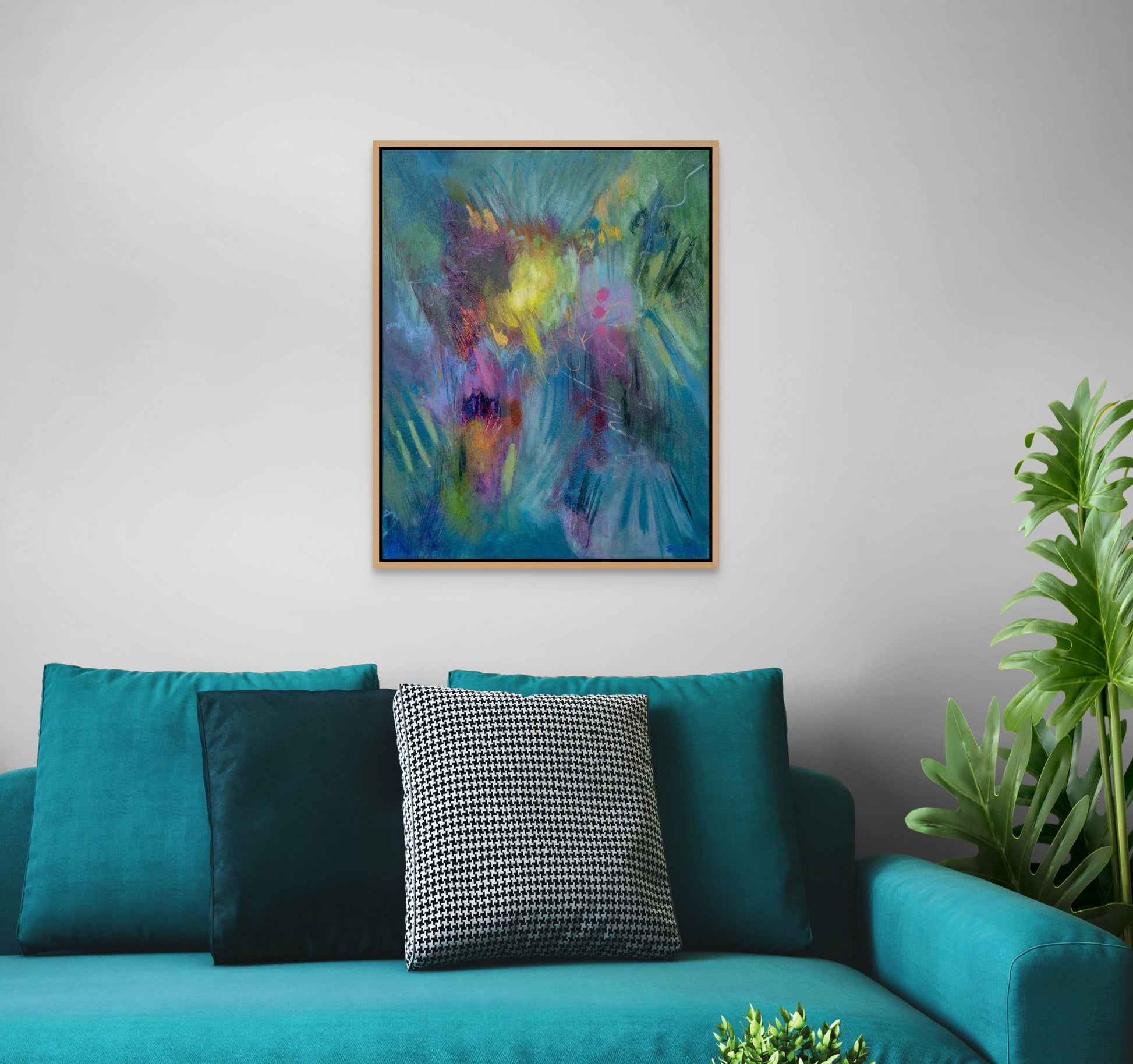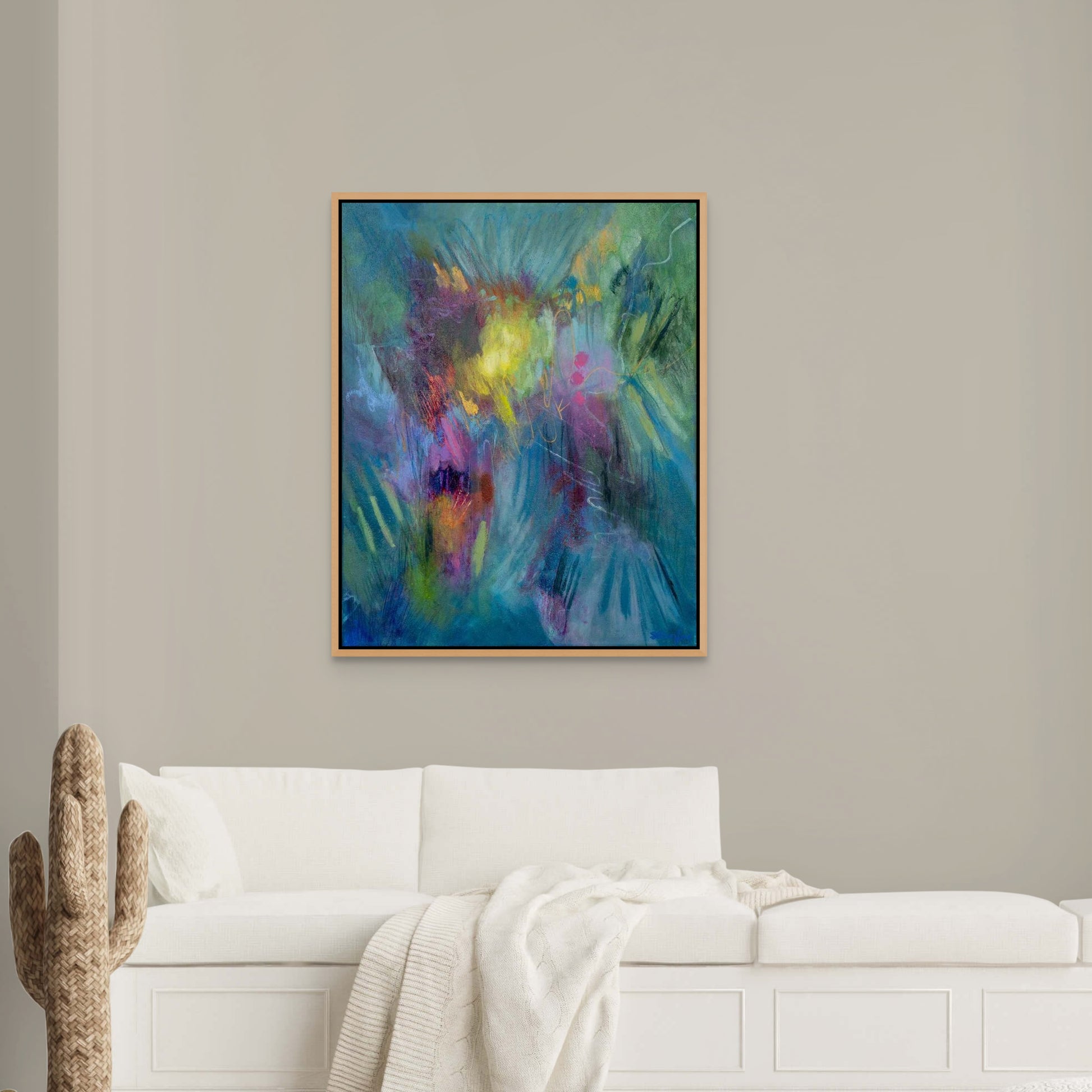 All paintings on canvas are unframed. The sides are painted in the same colours as the main canvas so that the canvas can be hung unframed. Some buyers prefer to frame their canvases, a range of floating frames can be bought from frame suppliers. A slim wood or even gold or a muted metallic frame would look good.