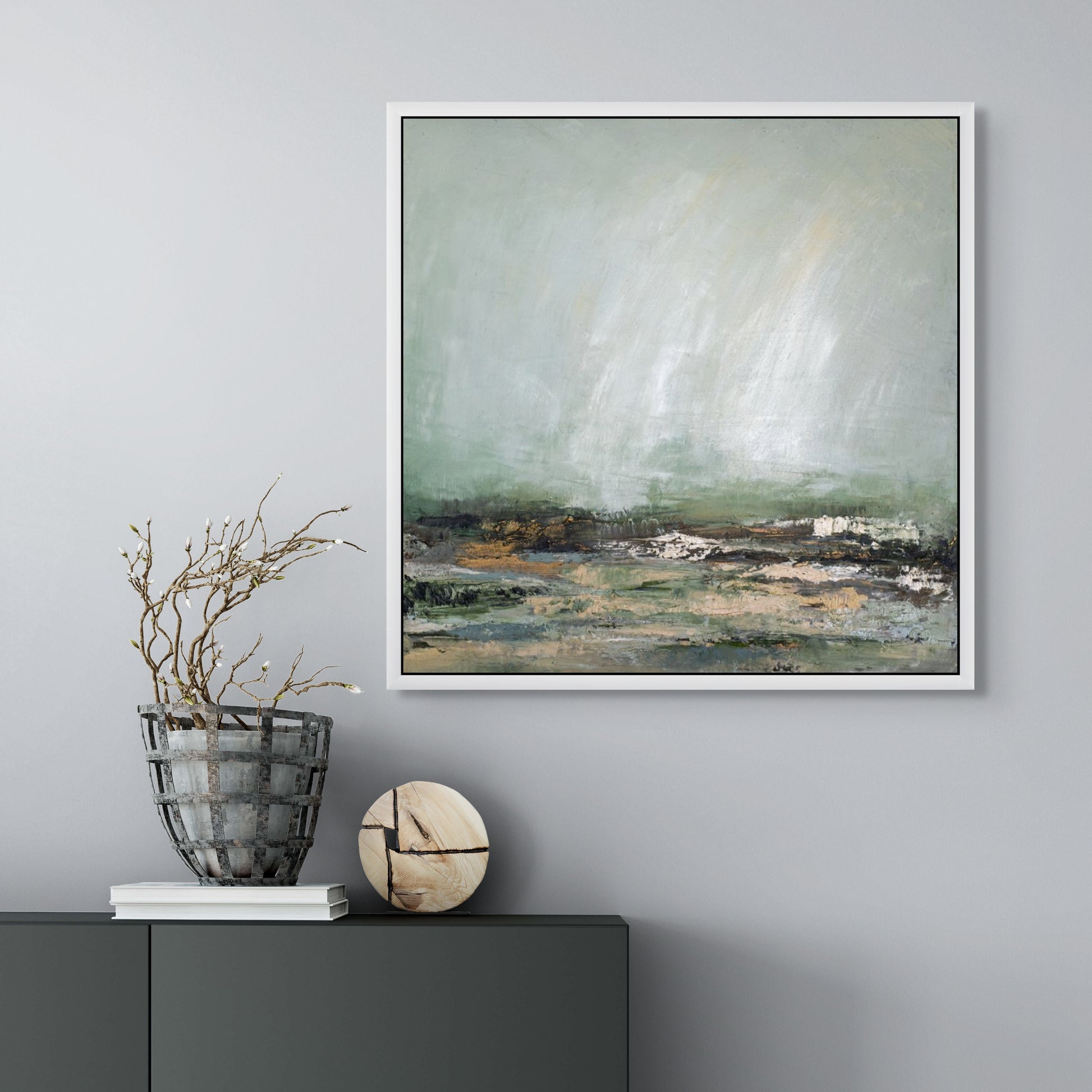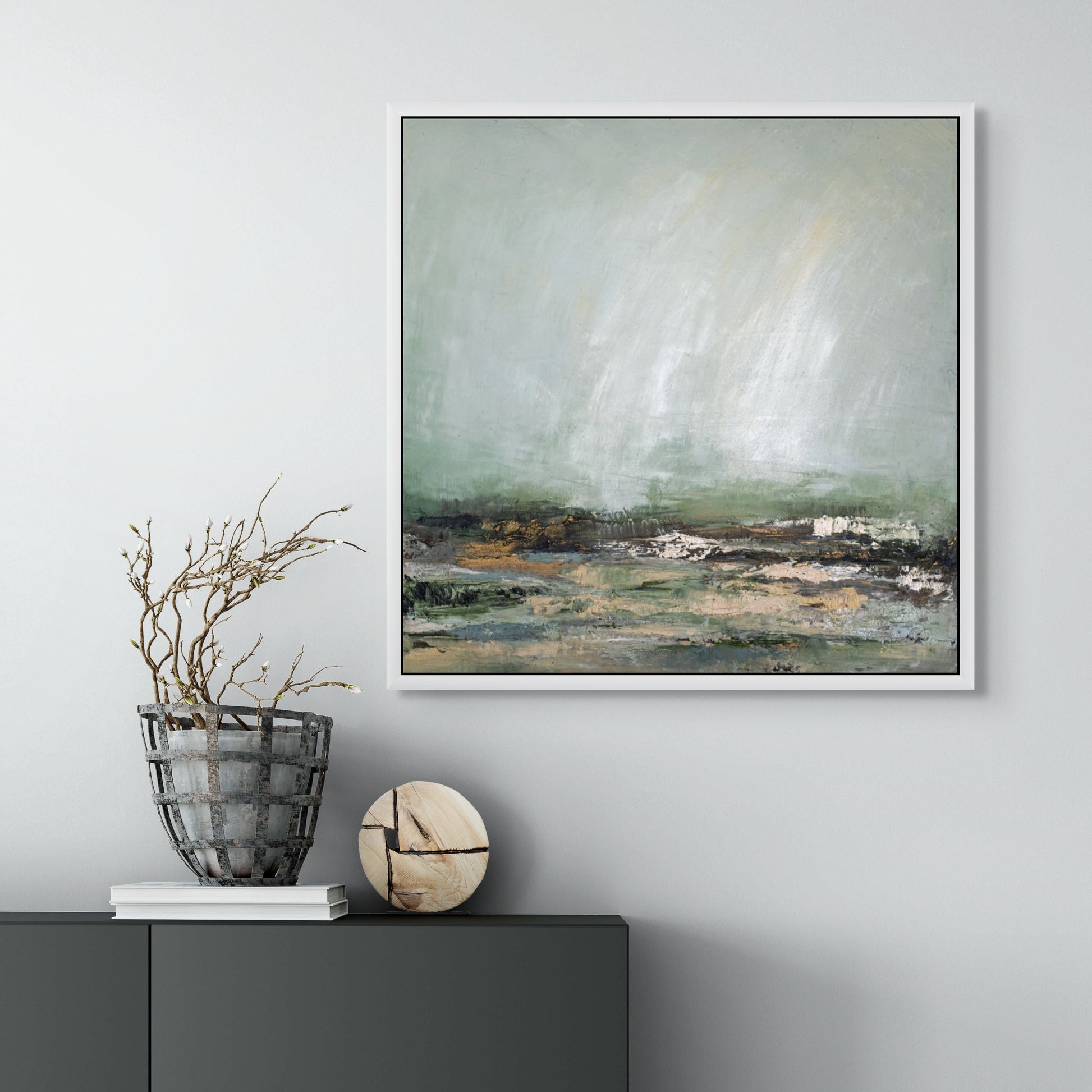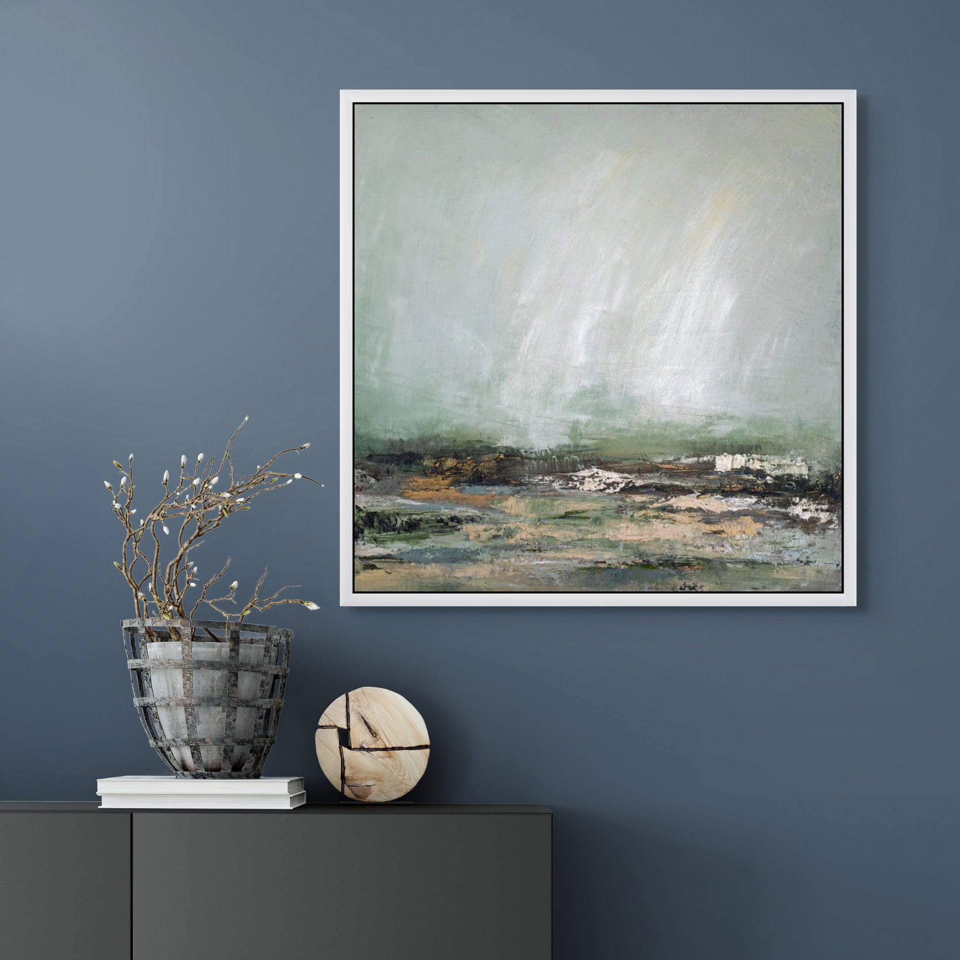 This painting is framed in a 10cm white floating frame. It has a small gap between the painting and the frame. It has a protective layer of cold wax applied t it.