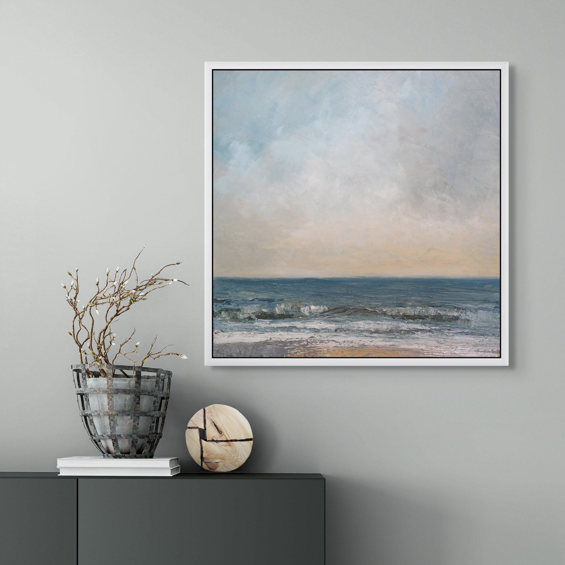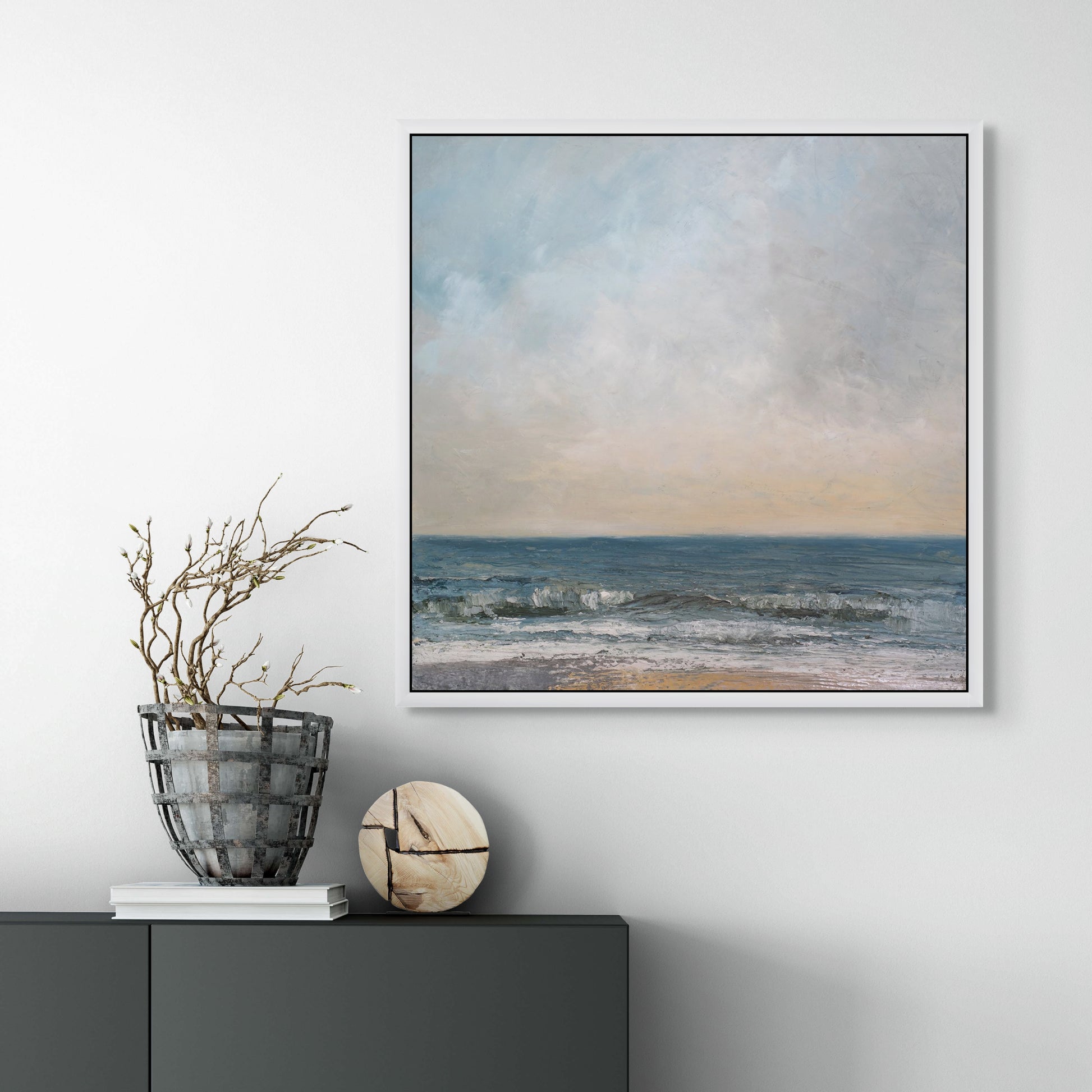 This painting is framed in a 10cm white floating frame. It has a small gap between the painting and the frame. It comes ready to hang with D-rings and picture string attached. It has a protective layer of cold wax applied t it.