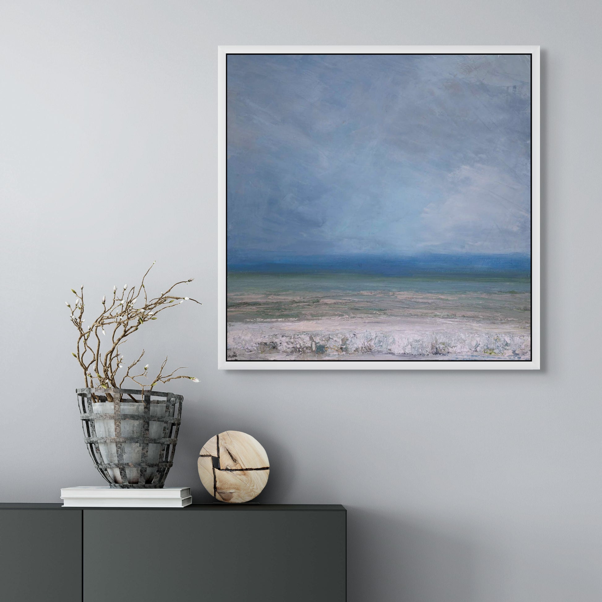 This painting is framed in a 10cm white floating frame. It has a small gap between the painting and the frame. It comes ready to hang with D-rings and picture string attached. It has a protective layer of cold wax applied t it.