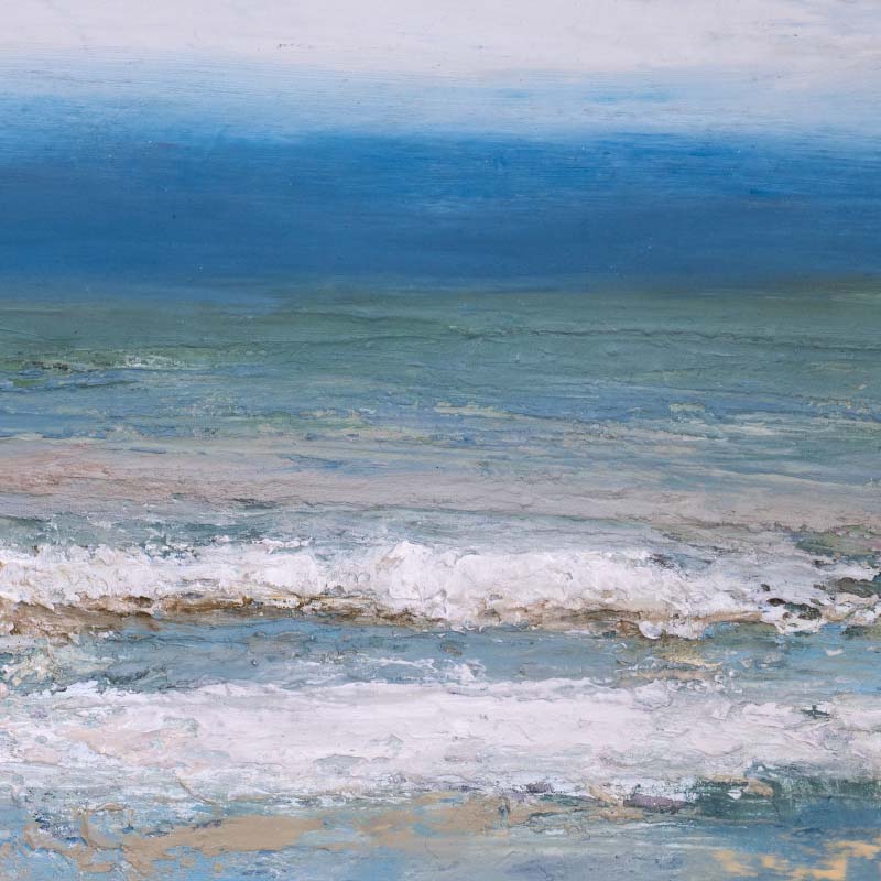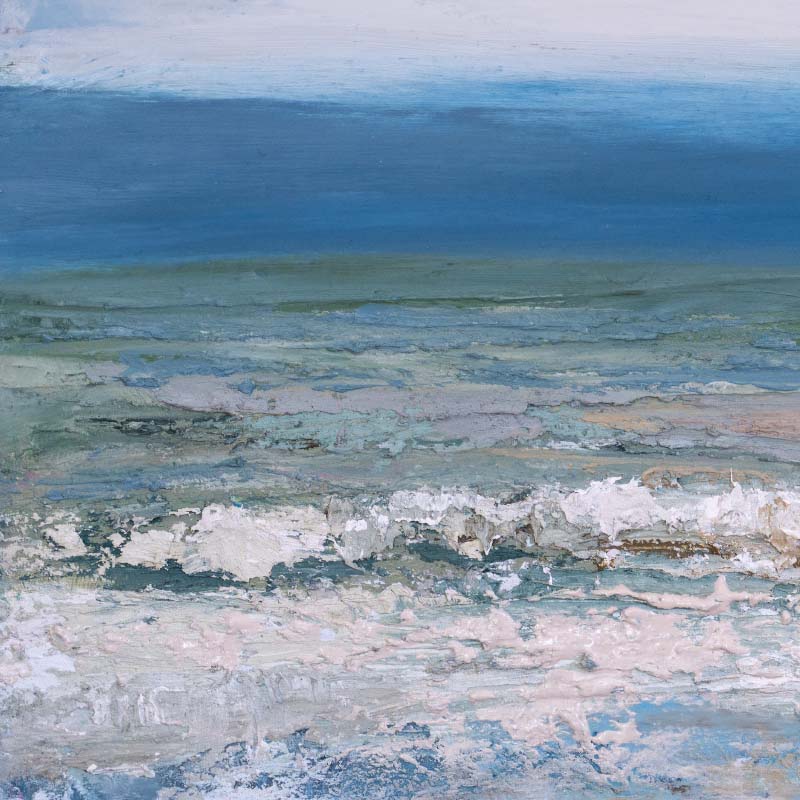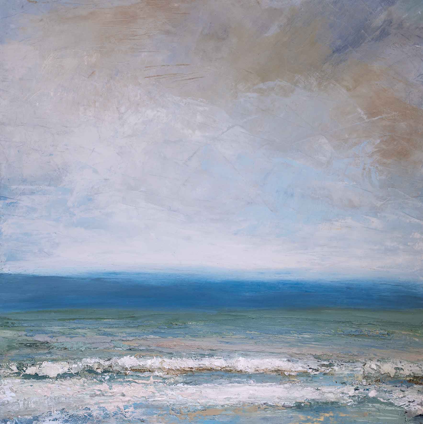 A beautiful painting in which the skies begin to fill with thick white cloud. The white contrasts so well with the radiant blue. Would look good on it's own, or hung with any others in the series.