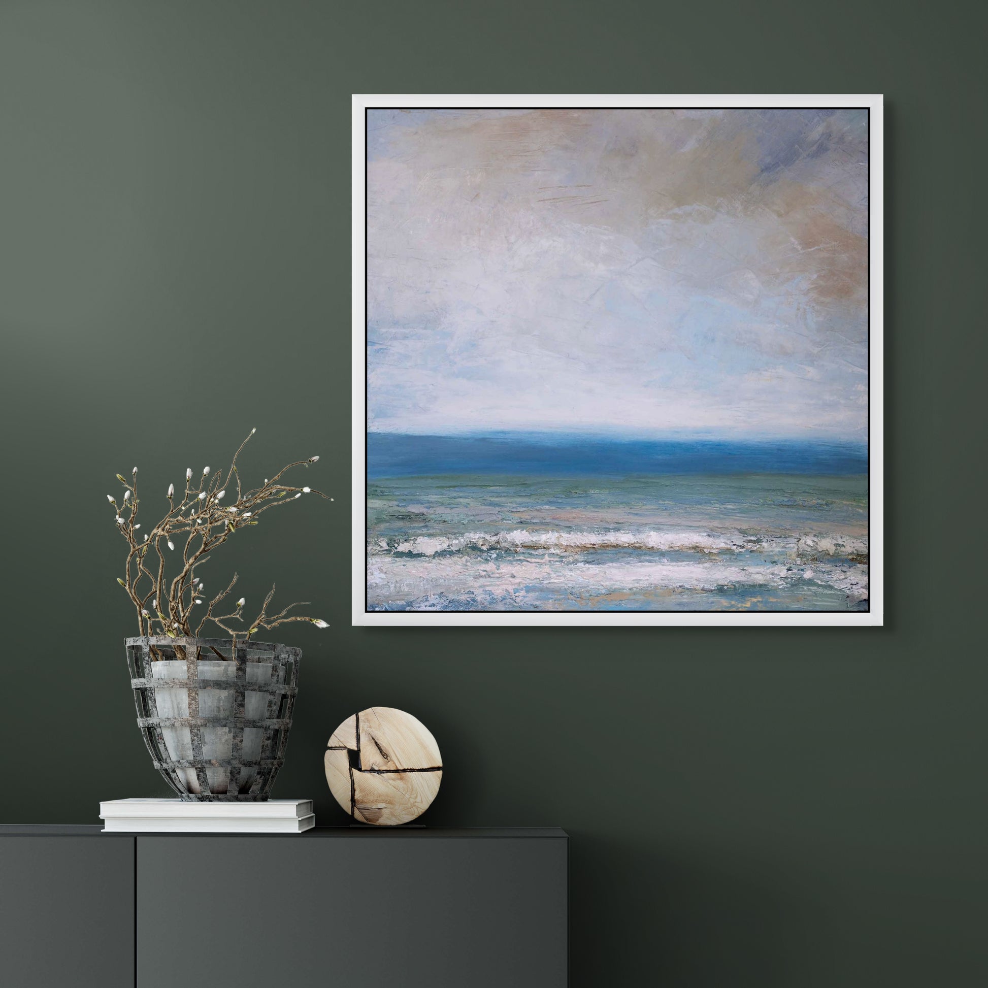 This painting is framed in a 10cm white floating frame. It has a small gap between the painting and the frame. It comes ready to hang with D-rings and picture string attached. It has a protective layer of cold wax applied t it.