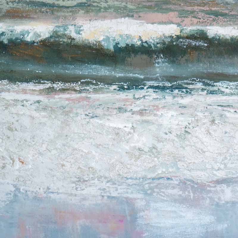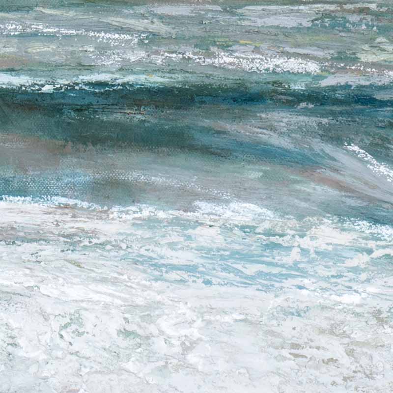 This painting is very textured. The white bits of the ocean are about 1cm off the surface and you really get the feeling of the froth and foam rushing and bubbling. It is a dramatic painting and the colouring will go in most settings. You can see the chopping and cutting movement of the tools used to apply the wax, particularly in the sky and this adds to the drama and energy of the piece. this painting would make a great centre piece in any setting.
