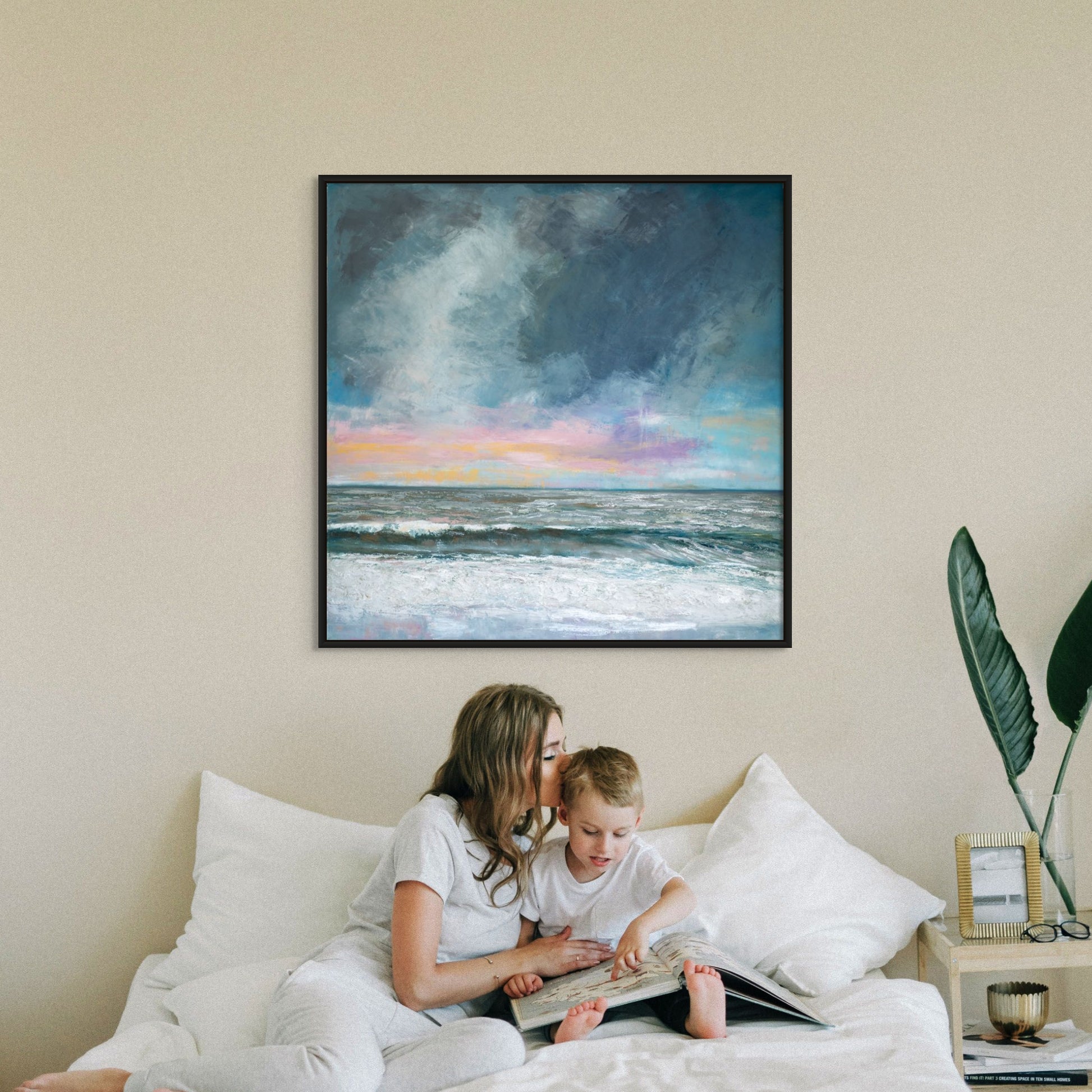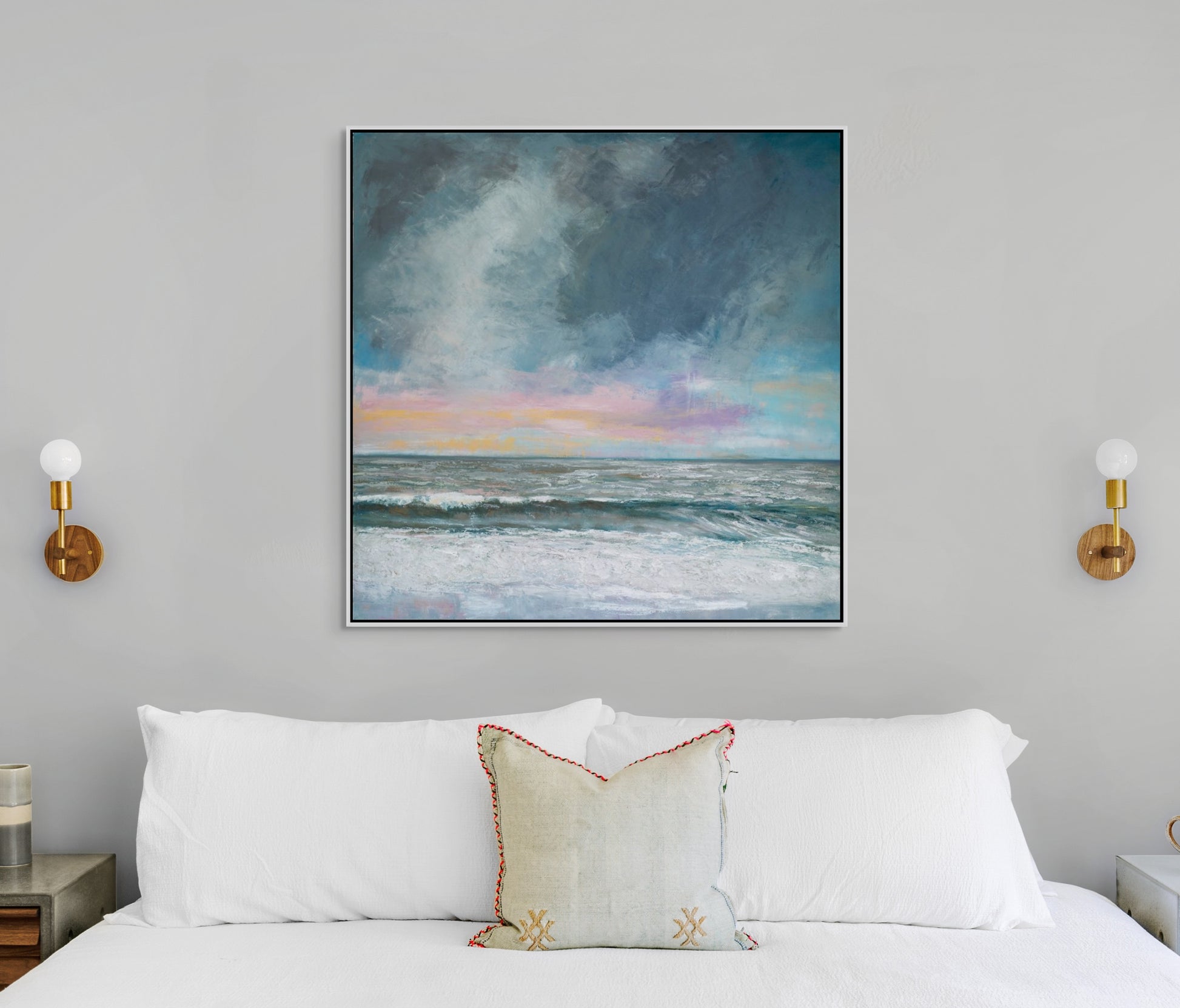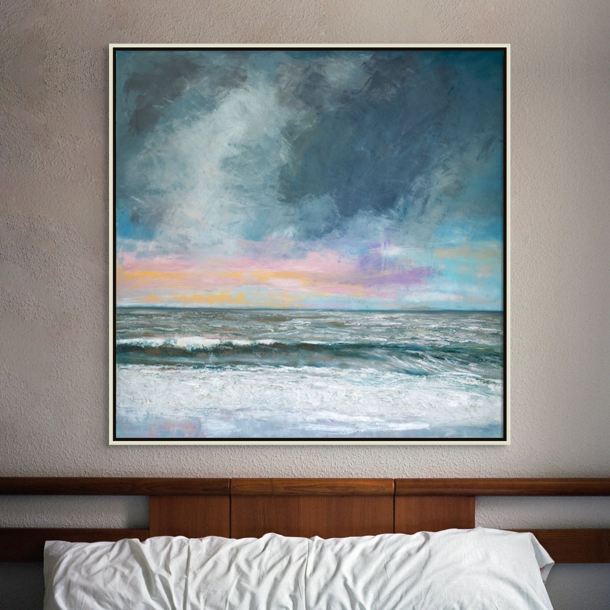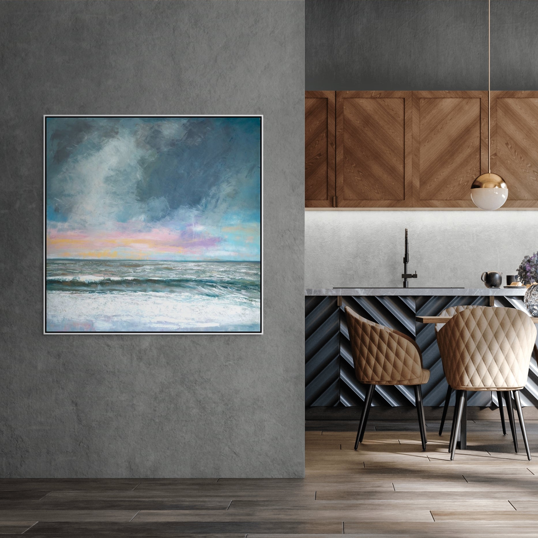 This painting is unframed. It is on deep edged 4cm canvas. The sides are painted white. It has been sealed with a protective layer of wax medium. The painting comes ready to hang with D-rings and hanging string attached. These paintings look great in a floating frame with a gap between the edges and the canvas. I would be happy to arrange for it to be framed for you or I would be happy to offer you some advice about framing. Please contact me and I'd be happy to help.