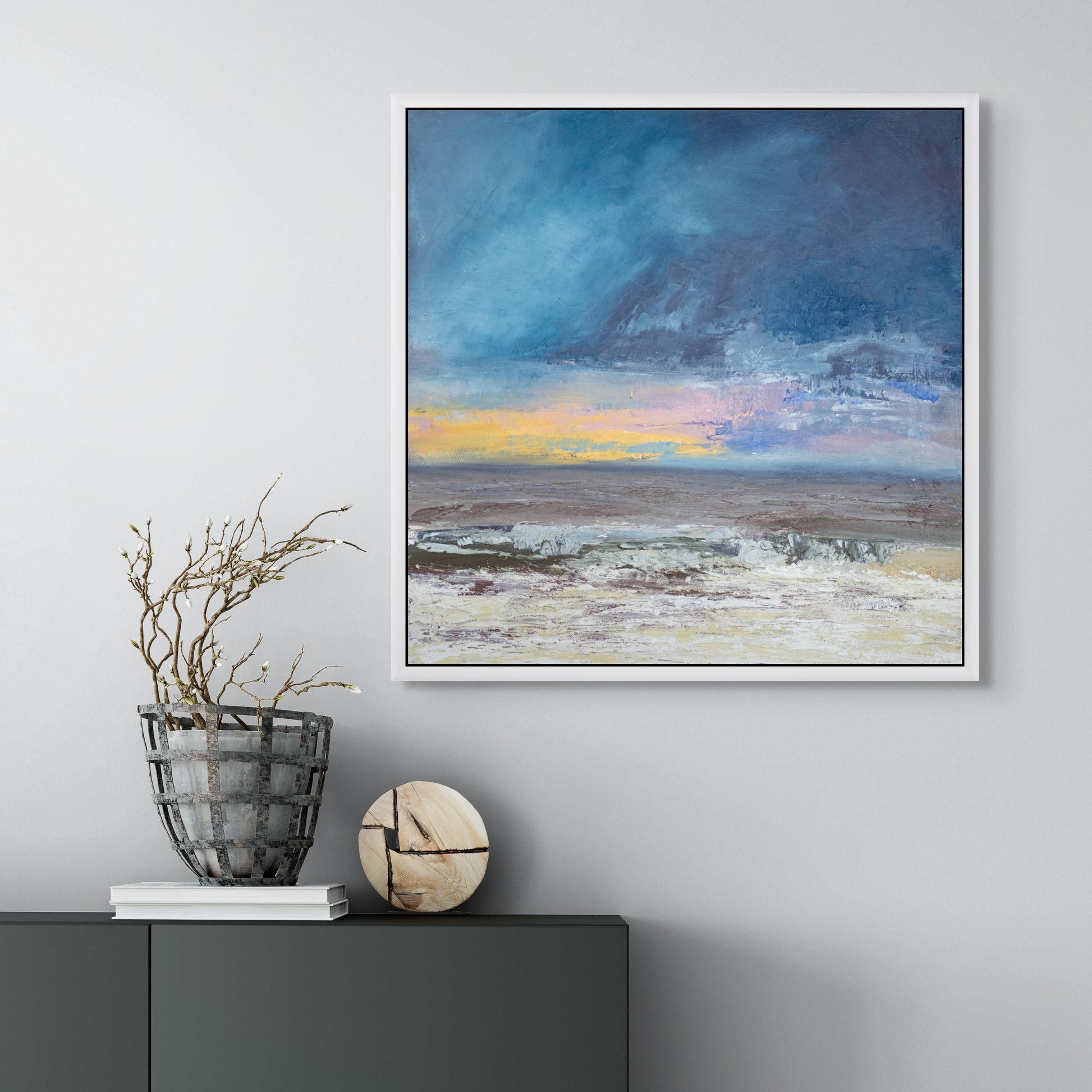 This painting is framed in a 10cm white floating frame. It has a small gap between the painting and the frame. It has a protective layer of cold wax applied t it.