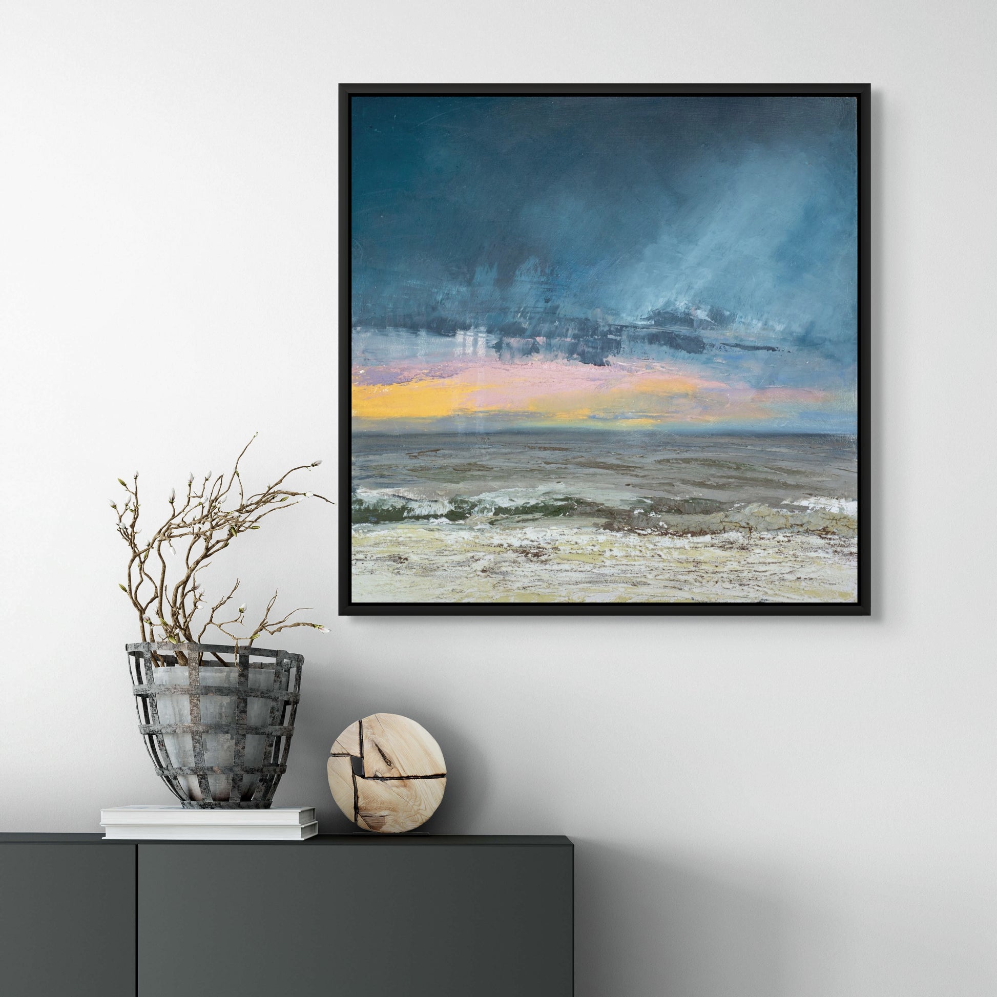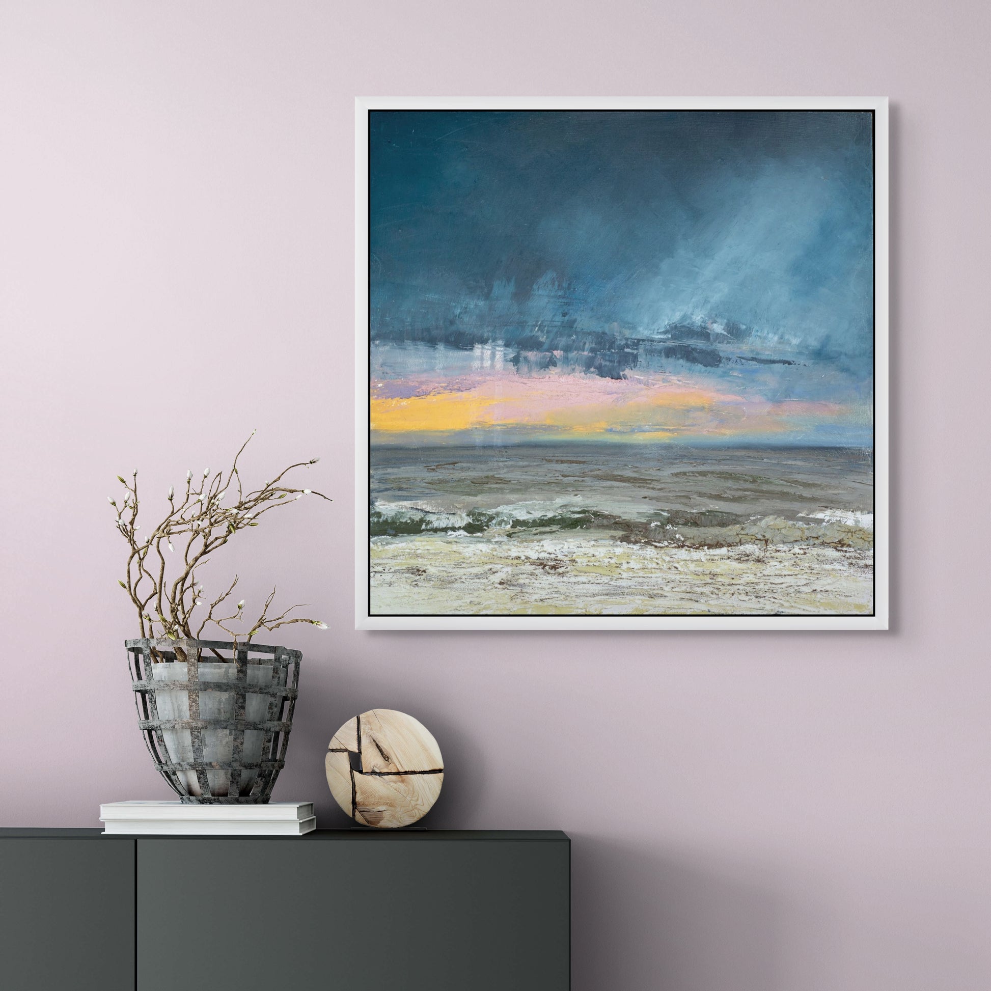 This painting is sold framed. You can choose between a black or a white floating frame with a small gap between the painting and the frame. It will come ready to hang. It has a protective layer of cold wax applied to it. Please contact me if you would like to discuss the choice of frame.