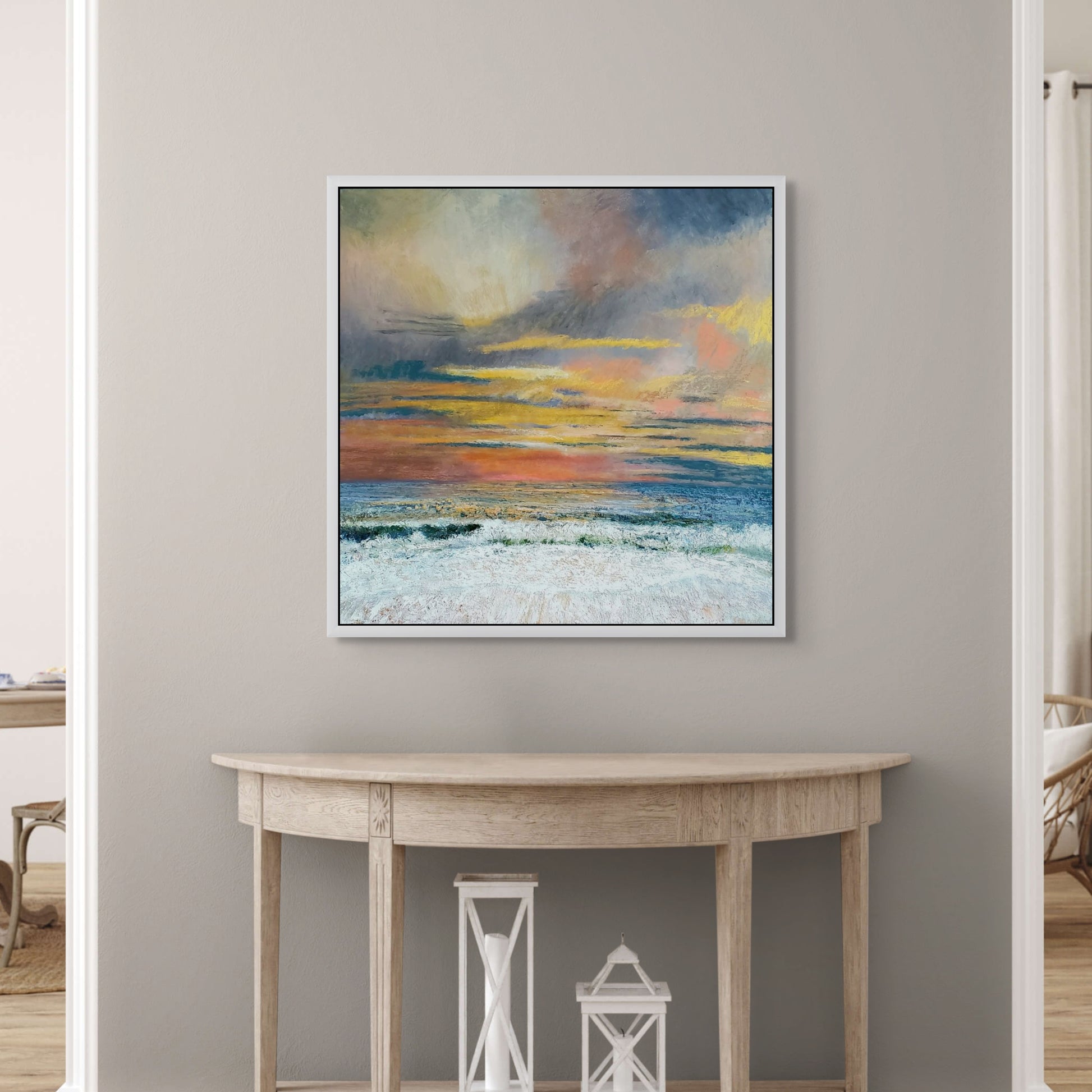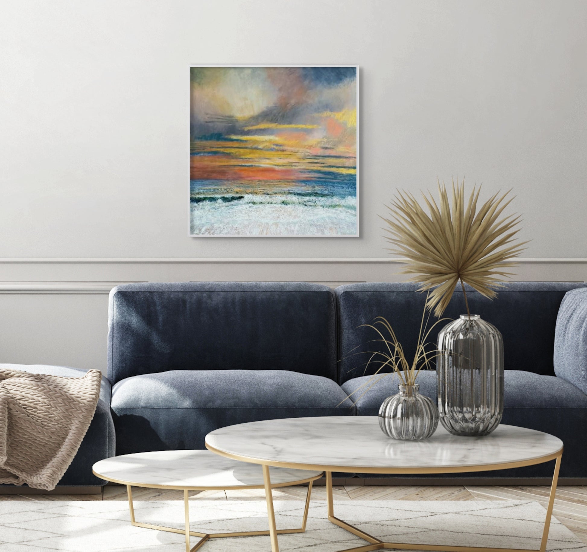 This painting is framed with a 10cm face floating frame with a small border between the frame and the board. I It has been sealed with a protective layer of wax medium. The painting comes ready to hang with D-rings and hanging string attached.