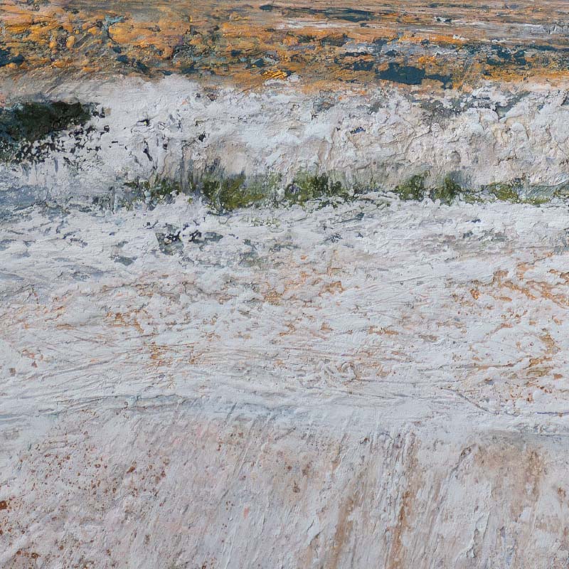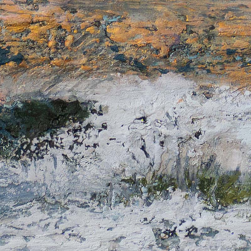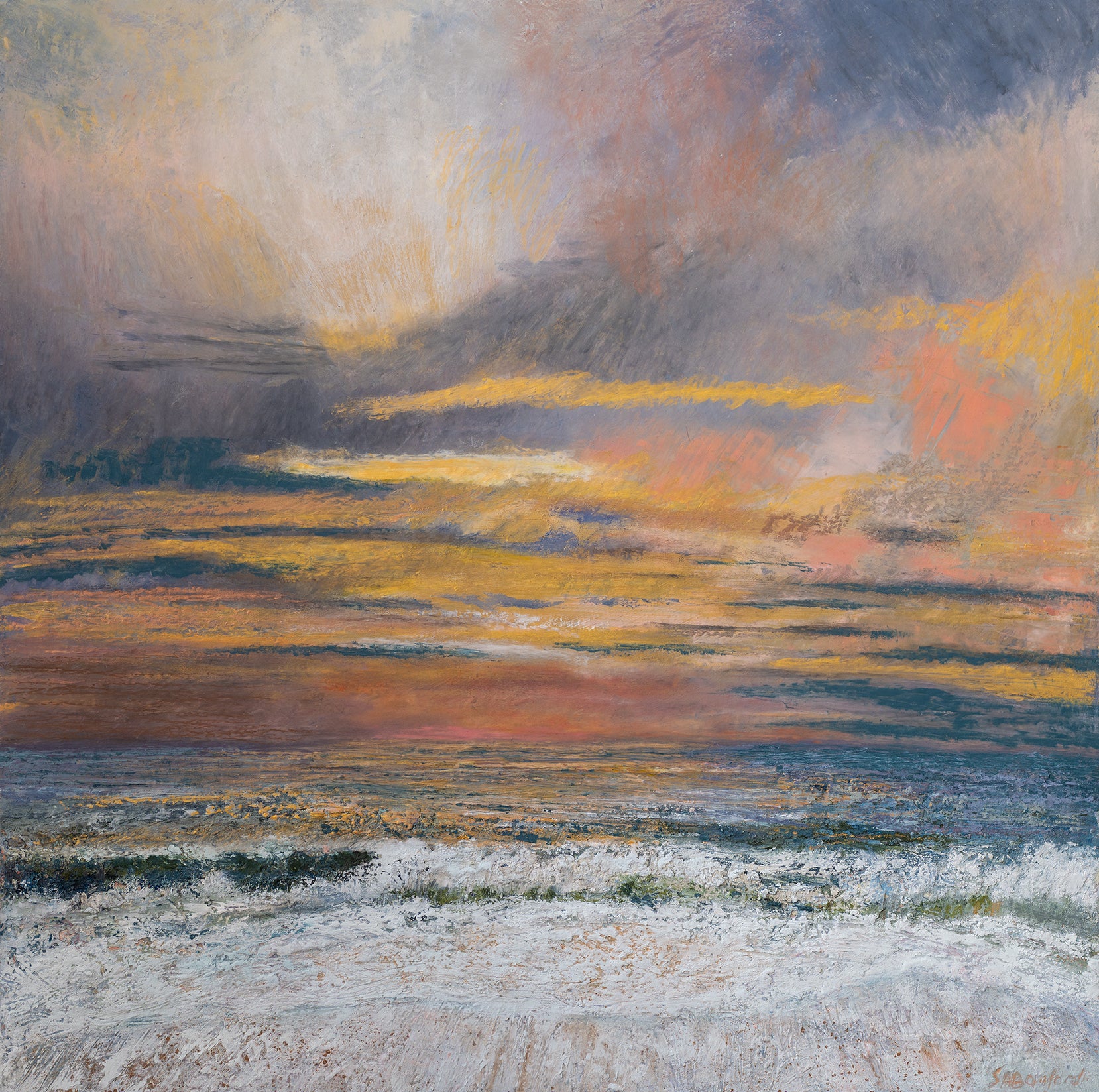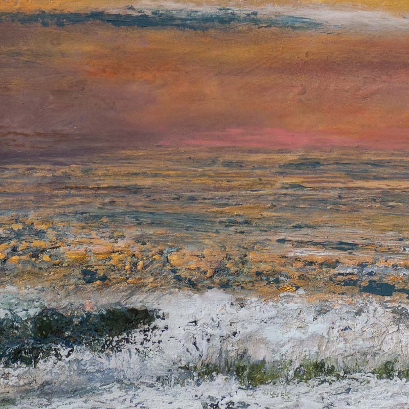 Inspired by early mornings just after sunrise in cold January, this painting is full of golds, peaches and Burgundy. It is the joy captured when only dog walkers are up and on the beach. The reflections on the waves are gleaming gold. I like to walk towards the golden path and breathe the gold in, like a mediation. It is very life affirming.